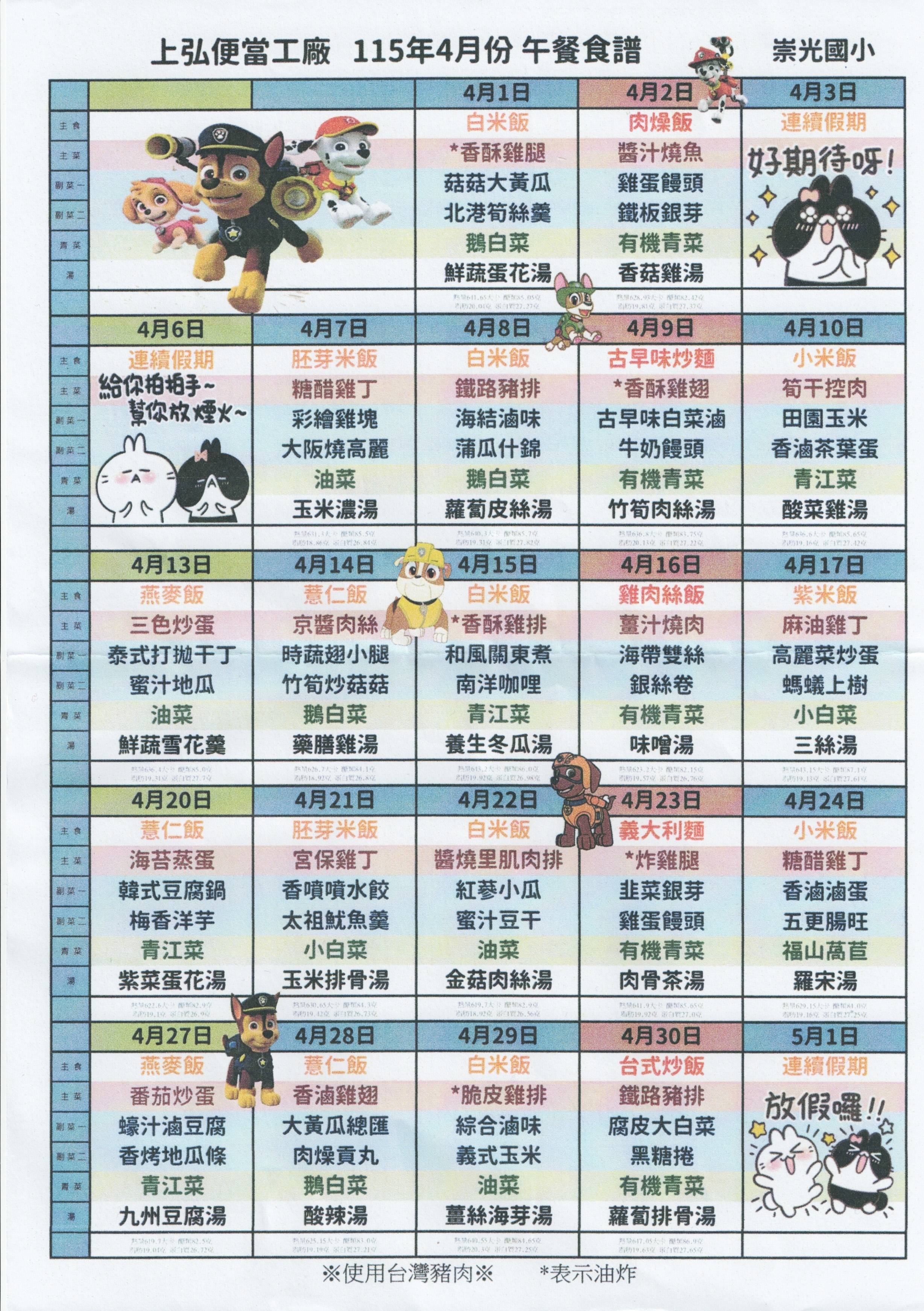 崇光國小附設幼兒園115年04月份--午餐菜單